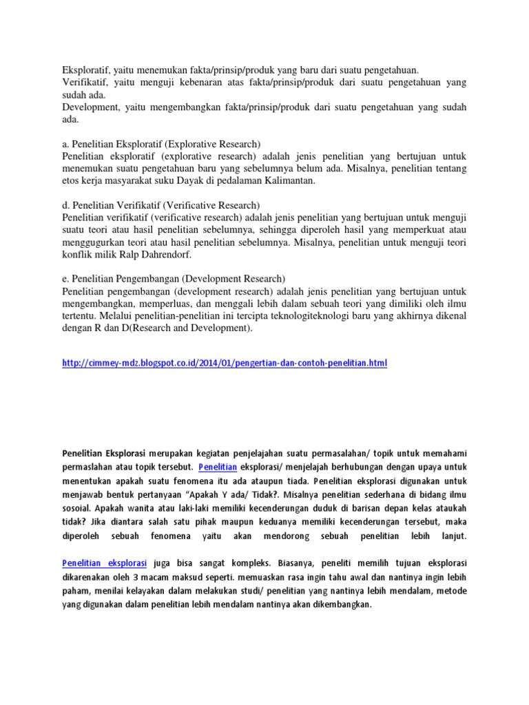 Ada beberapa jenis penelitian yang dapat dilakukan, salah satunya adalah penelitian yang bergenre research and development (r&d)/ penelitian dan pengembangan. Verifikatif, yaitu menguji kebenaran atas fakta/prinsip/produk dari suatu pengetahuan yang sudah ada. Pengertian metode penelitian dan pengembangan (research and development) metode penelitian dan pengembangan atau dalam bahasa inggrisnya research and development adalah metode penelitian yang digunakan untuk menghasilkan produk tertentu, dan menguji keefektifan produk tersebut. Sebagai contoh jika akan mengembangkan produk di sekolah maka peneliti terlebih dahulu mencari tahu masalah pembelajaran apa yang dihadapi guru dan siswa. Jenis penelitian ini adalah penelitian deskriptif dan verifikatif.