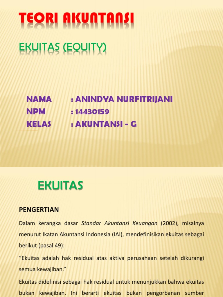 Teori ekuitas adalah teori yang menjelaskan sudut pandang yang digunakan dalam akuntansi berkaitan dengan penyusunan dan penyajian laporan keuangan. Fitri ramdhani sariati siti sarahadi 1. Teori akuntansi merupakan bagian penting dari praktik. Bab i pandahuluan 1.1 latar belakang untuk perusahaan perseorangan, ekuitas sering disebut modal. Tetapi juga cocok untuk perusahaan persekutuan.