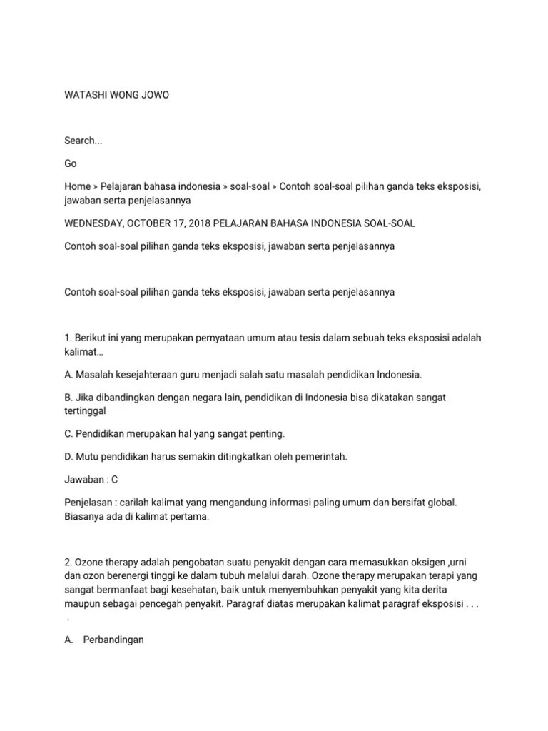 Ringkasan materi teks eksposisi disertai contoh soal dan jawaban berikut pembahasan lengkapnya! Lengkap 45 contoh soal essay bahasa indonesia kelas 10.berikut ini adalah contoh soal pilihan ganda teks eksposisi kelas 12 beserta jawabannya soal essay . Tesis dalam struktur teks eksposisi adalah suatu bagian yang . Indonesia kelas x semester 1 bagian kedua, yaitu tentang teks eksposisi. Contoh soal essay teks eksposisi dan jawaban to take your assignment .